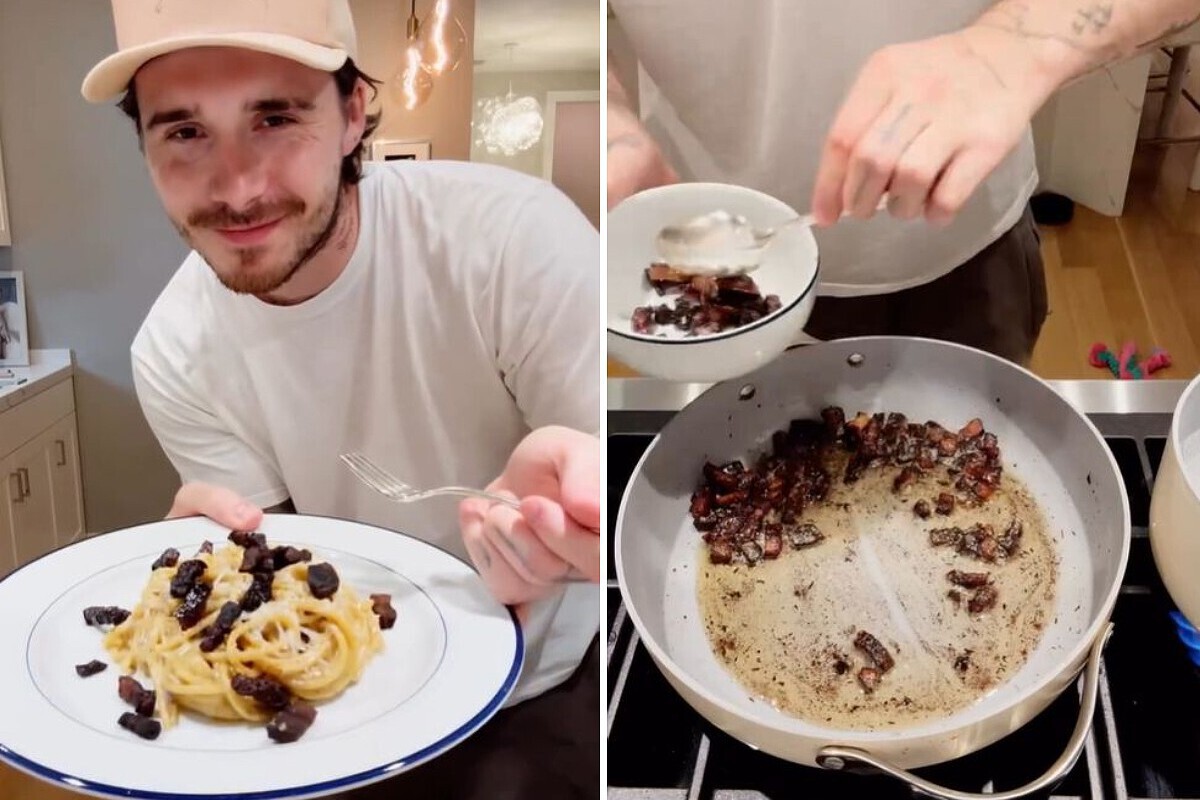 Brooklyn comienza su vídeo en Instagram anunciando, junto a sus dos perros, que va a preparar unos espaguetis a la carbonara al estilo italiano. Y empieza bien, cortando en trozos generosos una buena pieza de auténtico guanciale, en lugar de recurrir al típico bacon estadounidense. Parece que emplea una buena marca de pasta y echa abundante sal a la olla, usando además del tipo Maldon. Y hace una carbonara como mandan los cánones, sin nata, solo con huevos, agua de cocción y queso.