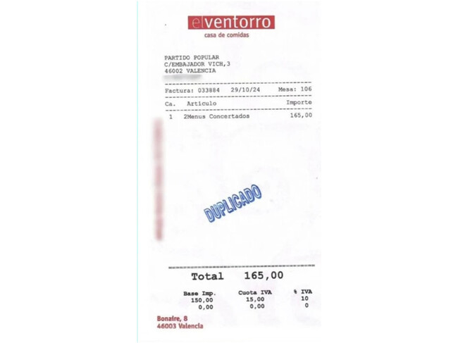 Con los documentos aportados por Romero a la causa, que incluye imágenes de los espacios del restaurante, aparece también el importe de la comida que Mazón y Vilaplana tomaron ese día: 165 euros, en un exiguo ticket que atestigua, entre otras cosas, que la factura fue pagada por el PP valenciano.