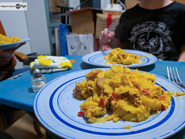 Ayer hice, por ejemplo, un revuelto campero. Primero, usé la opción de freír para hacer unas patatas fritas. Una vez estaban listas las reservé, quité un poco de aceite, y con la función saltear cociné cebolla, pimiento y chorizo. Después, como también se puede controlar la temperatura, la puse a 100º C para reincorporar las patatas, añadir el huevo batido, y hacer un revuelto que me quedó muy jugoso.