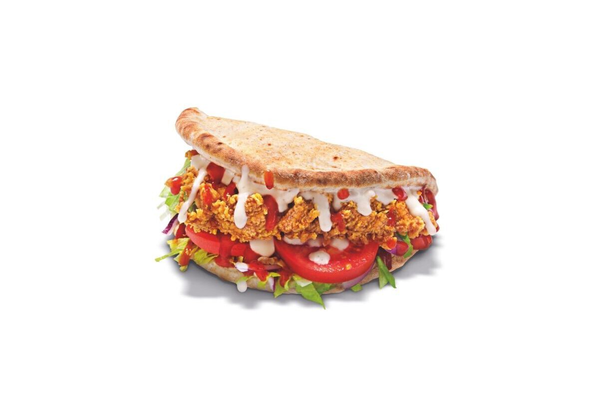 La propuesta se concreta en varias versiones. El kebab de pollo frito utiliza pan de pita clásico, relleno con un filete rebozado al estilo de la marca, acompañado de lechuga, tomate y cebolla morada. El giro está en las salsas: una roja tipo kebab y otra blanca de yogur con ajo, que buscan acercarse al sabor reconocible del formato original.