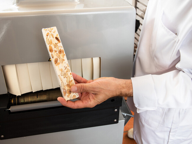 Se añaden entonces trocitos de almendra tostada para otorgar textura granulada al producto. Seguidamente, se extrae manualmente la mezcla, se reparte en moldes y se deja reposar y enfriar durante 24 horas. Por último, ya solo queda cortar en tabletas y empaquetar. Antiguamente, la fase de corte se realizaba con instrumentos de lo más rudimentarios -serruchos, cuchillas, alambres, ¡incluso hemos visto una bayoneta francesa de la Primera Guerra Mundial!-. Obviamente, hoy existen métodos más precisos y rápidos de realizar la misma función sin que por ello se pervierta la esencia de la tradición.