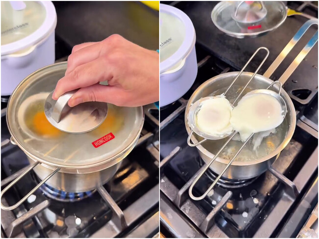 Sobre ese colador, casca un huevo y, a continuación y con el agua hirviendo, pon una tapa para ese cazo o cazuela. Con el hervor del agua y la condensación del vapor en la tapa, vas a conseguir unos huevos escalfados al vapor sin complicarte, sin perder 'clara' y con todo su sabor, renunciando al vinagre.