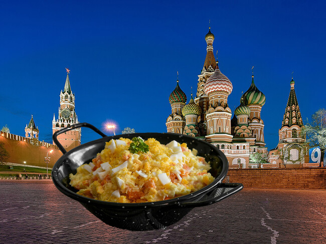 La denominación de esta elaboración, en Rusia, es ensalada Olivier y es uno de los platos más tradicionales de su gastronomía. Fue inventada por el belga Lucien Olivier en 1860, chef del Hermitage, uno de los restaurantes más populares de Moscú en aquella época. Un plato que tuvo mucho éxito entre los clientes habituales y que se convirtió en el icono de la casa en poco tiempo.