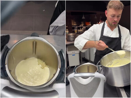 Tras esto, lo fundamental con la cebolla sudada es comprobar cómo de espesa vamos a quererla, así que añadimos cazos de la bechamel al robot de cocina con la cebolla sudada y trituramos hasta tener la textura deseada.