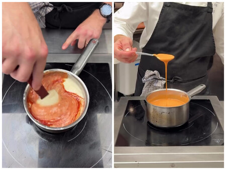 Una de ellas, quizá la más conocida, es la salsa mornay, donde se mezcla la bechamel con un queso, hasta que funda bien y esté bien integrado. También clásica es la salsa soubise, donde se tritura la bechamel con cebolla pochada, pero la salsa que os va a permitir hacer unos canelones de carne sin que realmente lleven boloñesa, pero tengan tomate es la salsa aurora.