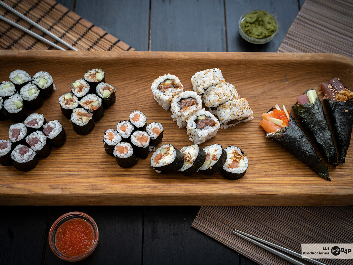Futomaki: máximo cuatro ingredientes de la lista. Una bola de arroz que llene casi toda la hoja entera de alga nori dejando dos dedos de la parte superior sin arroz para poder cerrar. Disponemos en el centro del rectángulo de arroz los ingredientes y enrollamos juntando los extremos del arroz. Mojamos el extremo del alga que no tiene arroz con agua y terminamos de enrollar para que quede pegado y cerrado. Cortamos con cuchillo muy afilado y limpio por la mitad. Juntamos las dos mitades y cortamos en cinco, quedando cada cilindro cortado en 10 pedazos