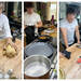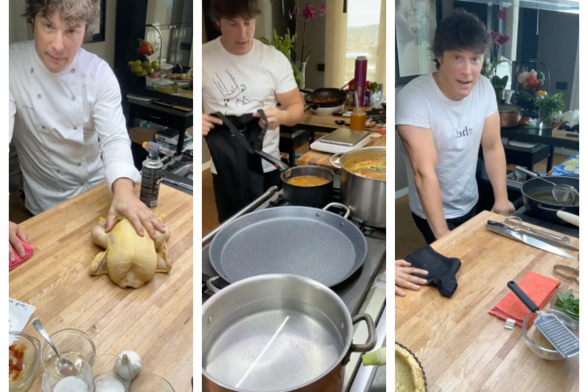 Otros tiros de cámara con los que juega el cocinero, permiten también ver una gigantesca campana extractora gris metalizada, más profesional que doméstica, y unos muebles de almacenamiento blancos con tiradores metalizados, que contribuyen a dar más luz todavía al espacio.