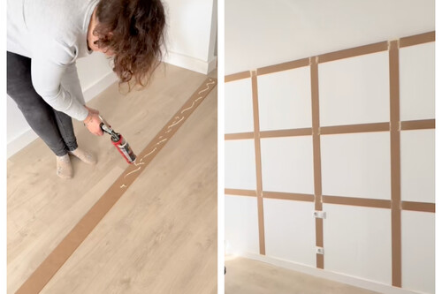 La primera opción consiste en pegar paneles de MDF –también conocidos como DM– directamente a la pared. La clave es no dejarlos en plano liso, sino jugar con un trazado geométrico que recuerde al de las boiseries clásicas. Una vez fijados, basta aplicar una capa de pintura en un tono uniforme para conseguir un acabado sobrio y sofisticado.