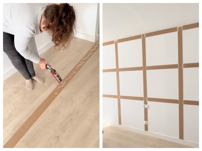 La primera opción consiste en pegar paneles de MDF –también conocidos como DM– directamente a la pared. La clave es no dejarlos en plano liso, sino jugar con un trazado geométrico que recuerde al de las boiseries clásicas. Una vez fijados, basta aplicar una capa de pintura en un tono uniforme para conseguir un acabado sobrio y sofisticado.