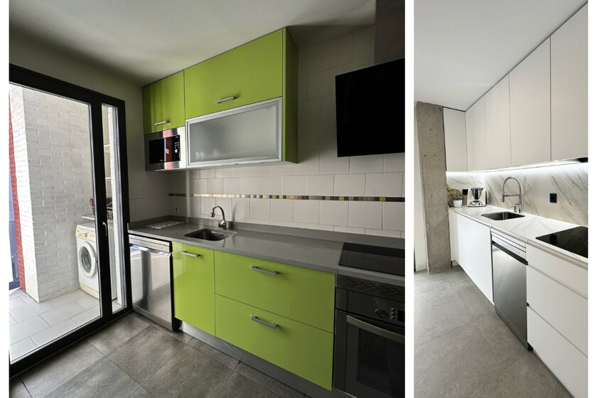 El cambio más importante en este caso ha sido la eliminación de tabiques para unir la cocina con el salón, logrando un espacio diáfano donde la luz fluye de forma natural. El resultado es una estancia más amplia, práctica y acogedora, donde cocinar y convivir forman parte de una misma experiencia.