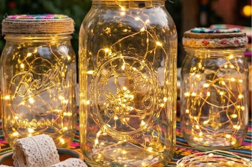 La idea es tan simple como efectiva: convertirlos en pequeñas lámparas decorativas con luces LED, ese tipo de iluminación tenue que recuerda a las luciérnagas y que funciona especialmente bien en cocinas, estanterías, dormitorios o terrazas. El vidrio juega aquí a favor, porque su transparencia multiplica el reflejo de la luz y aporta un efecto cálido muy limpio.