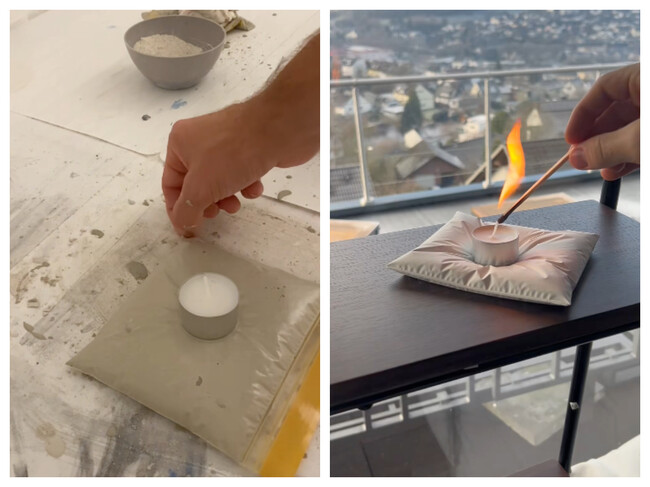 El proceso de elaboración es sencillo y accesible. Se crea una fácil mezcla de cemento con agua y se introduce en una bolsa zip. Al colocar un peso encima, como una vela o un objeto circular, se genera la presión que moldea el material en forma de almohada hundida.