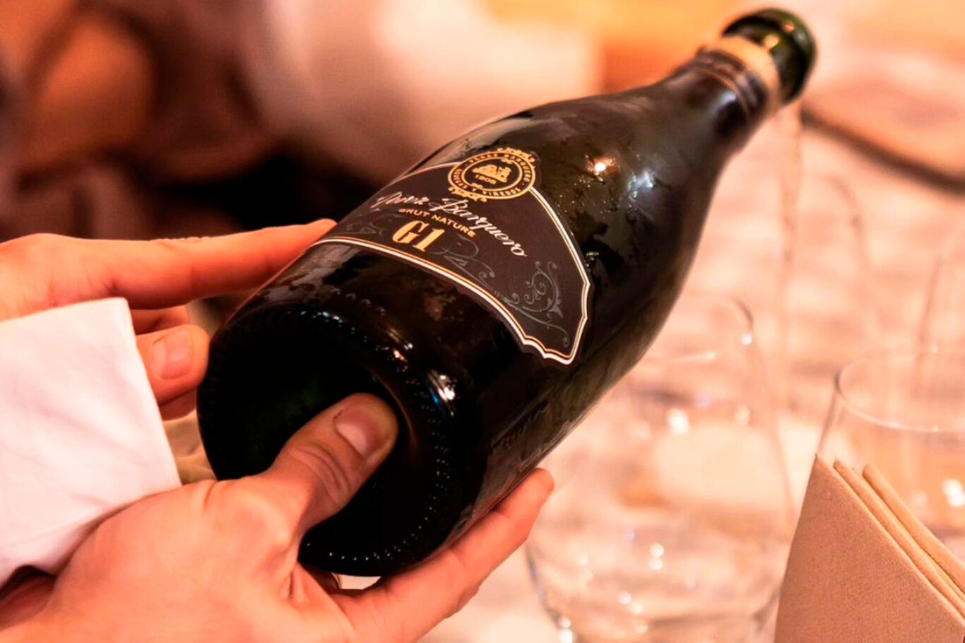 En copa, el G1 Brut Nature se muestra de color amarillo pálido con ribetes verdosos, limpio y brillante. La burbuja es fina, persistente y forma una corona elegante.