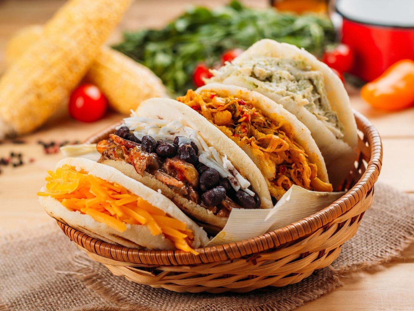 Se habla de una veintena de arepas distintas en Venezuela y más de cincuenta variedades identificadas solo en Colombia. Y no solo cambian en cuanto al relleno; hay arepas que incluyen huevo en la masa, otras se hacen con yuca o mezclando el maíz con patata cocida. El tipo de maíz y su tratamiento también multiplica el abanico de arepas regionales.