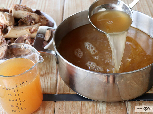 Para mejorar el sabor, muchos lo combinan con verduras diversas o añaden vinagre para que la acidez favorezca el pasaje de nutrientes al caldo. Se puede consumir como tal o bien utilizar este caldo para preparar posteriormente sopas, salsas, guisados, u otros platos de cuchara.