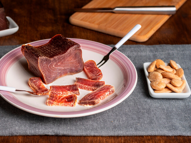 La mojama es una salazón muy tradicional, elaborada desde hace siglos en el sur de España y también en algunas zonas del Levante. Consiste en curar con sal y deshidratar trozos de pescado. Lo más habitual es que se elabore con atún de aleta amarilla, aunque también puede hacerse con otras variedades, como el atún rojo o el patudo.