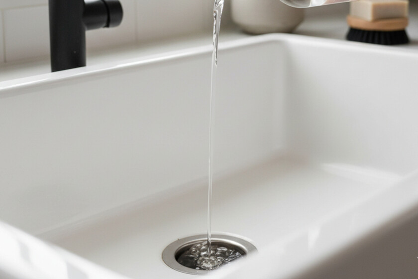 Una vez caliente, se vierte lentamente directamente por el desagüe. El calor ayuda a disolver la grasa solidificada y el ácido acético del vinagre actúa sobre los restos orgánicos acumulados. Verterlo despacio permite que el líquido se mantenga más tiempo en contacto con las paredes internas de la tubería.