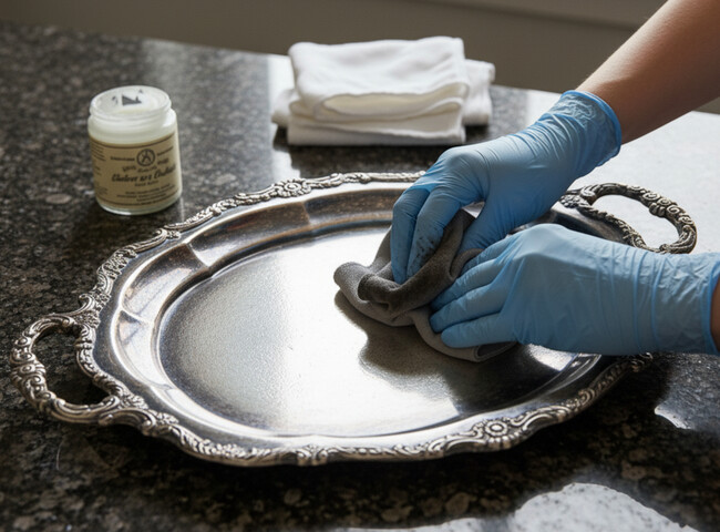 Para bandejas, teteras o candelabros, usa una mezcla de agua tibia y vinagre blanco con una cucharadita de bicarbonato. Limpia con un trapo húmedo y seca inmediatamente con otro seco para evitar marcas de agua.