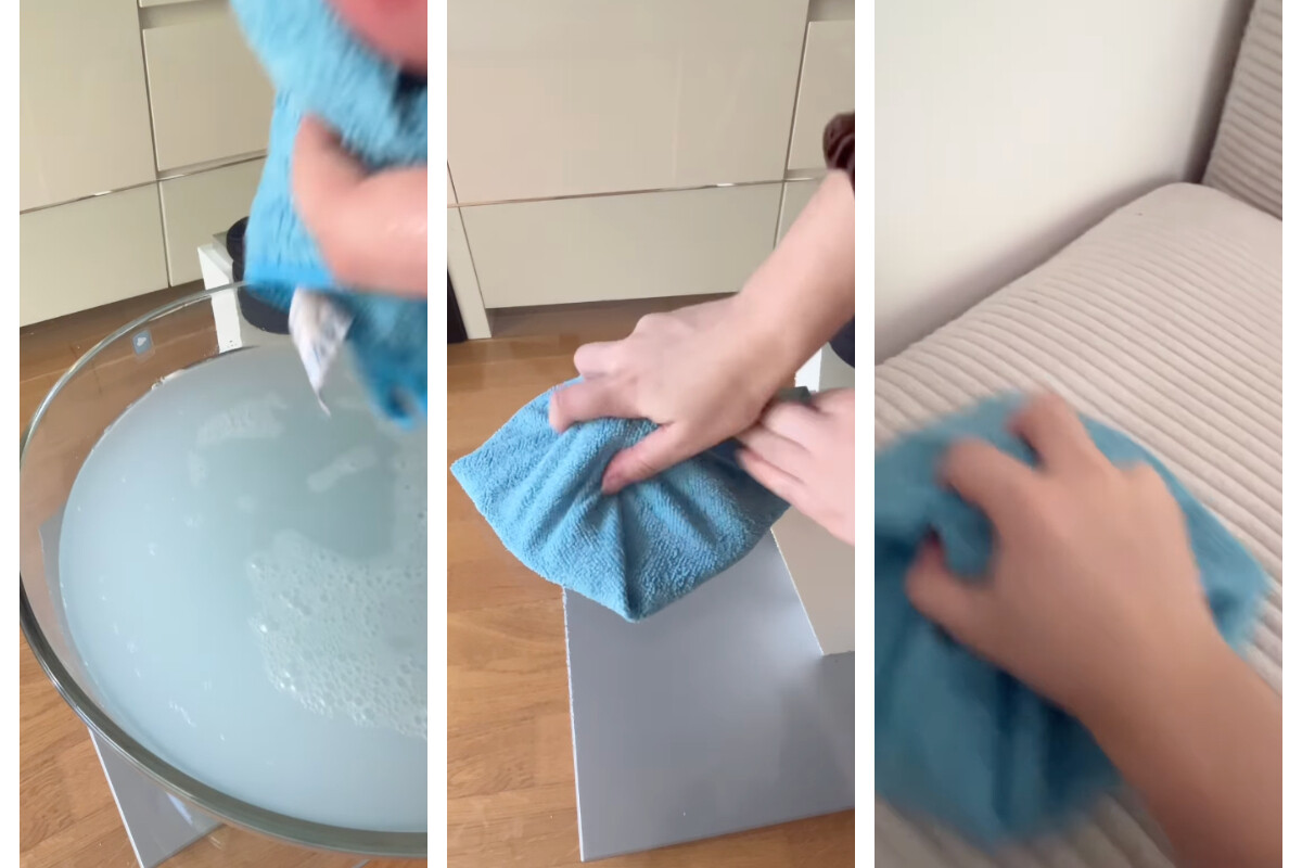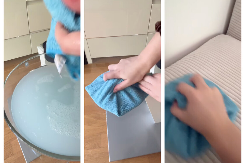 Esta solución servirá como base para eliminar manchas y olores no deseados. Una vez preparada la mezcla, se aconseja utilizar un paño limpio y suave para aplicarla sobre las áreas afectadas del sofá. Esta creadora de contenido se ayuda con una tapa de cacerola para mantener la bayeta más firme.