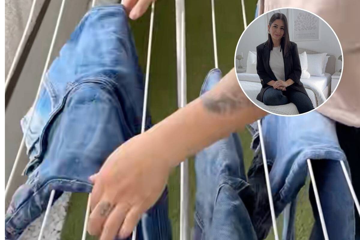En lugar de colgarlos por la cintura o por los bajos, propone una técnica que distribuye el peso de forma equilibrada y mejora la ventilación del tejido. Según explica en sus redes, el truco consiste en colocar cada pierna del pantalón sobre una varilla distinta del tendedero.