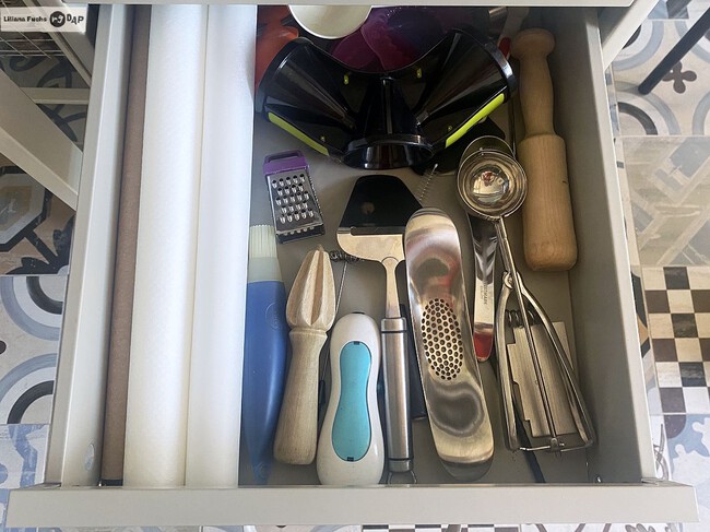 Obviamente en esta regla no entra todo-todo; lo ideal es aplicarla al típico cajón de trastos y chismes varios que todos tenemos, ya sea consciente o inconscientemente. Llámalo cajón, llámalo armario, caja, estante o cualquier lugar donde colocamos los chismes que no sabemos dónde poner. En la cocina todo el mundo tiene, al menos, uno de estos, y entra de todo: tijeras, hilo de cocina, moldes, cortadores, ralladores, cubiertos raros, prensa ajos, algún exprimidor, cucharas medidoras, etc, etc. ¿Seguro que lo usas todo?