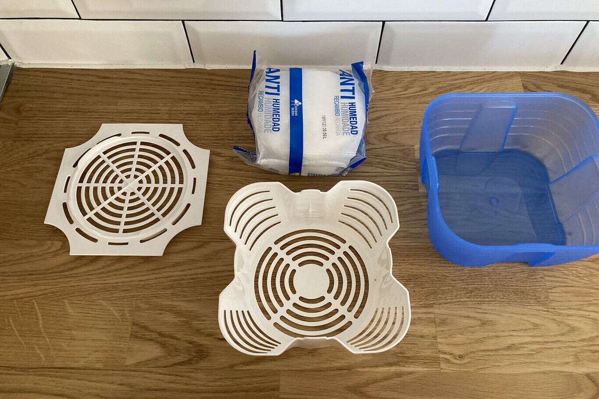 El dispositivo, de la marca Bosque Verde, incluye un recipiente con una tableta que absorbe el exceso de agua del ambiente, transformándolo en un líquido que se acumula en la parte inferior. El pack también incorpora una rejilla protectora y una tela que evita la suciedad.