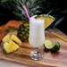 Luego añades una cuarta parte de zumo de lima, lo trituras todo bien fuerte con una buena cantidad de hielo picado hasta que tenga la textura de un batido y lo sirves en la típica copa de piña colada, que suele ser alta y estrecha, aunque también lo puedes poner en un vaso alto y un poquito más ancho.