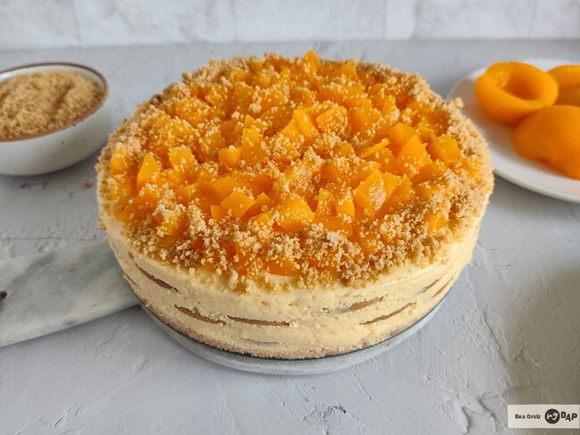Cubre el molde con film y deja reposar en la nevera toda la noche para que coja su textura final. Al día siguiente estará firme, fresca y lista para servir. La decoración es completamente opcional. Yo he optado por cortar más melocotones en almíbar y añadir un poco de galleta triturada en el borde. Para esto solo tienes que escurrir bien unas cuantas rodajas de melocotón, cortarlas en láminas finas y colocarlas encima de la tarta. Finalmente ya puedes desmoldar y servir.