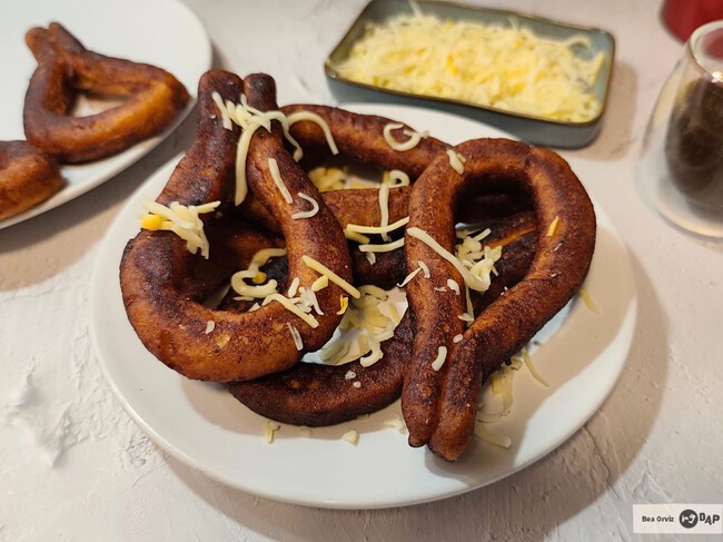 Para darles forma, lo más cómodo es pesar la masa y dividirla en porciones iguales. Yo la dividí en diez piezas de unos 60–65 g cada una, aunque entre 50 y 70 g es un tamaño perfecto. Con cada porción haces una bola, la ruedas sobre la mesa hasta formar un cilindro y unes las puntas para tener el clásico aro de mandoca. Luego solo queda freírlas en abundante aceite caliente hasta que estén bien doradas y crujientes. Quedan mucho más ricas con ese punto tostadito.