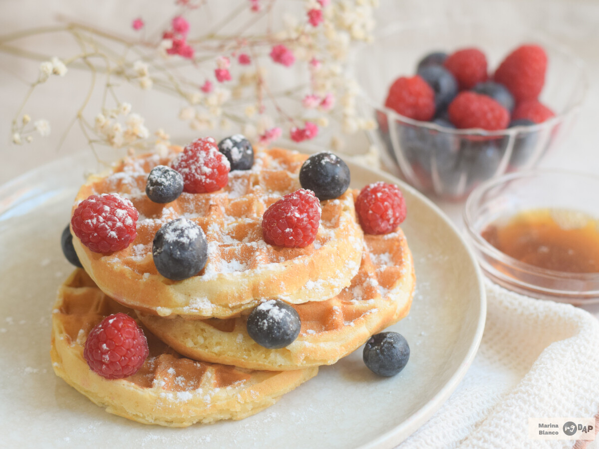 Una vez en la gofrera, el calor hace el resto: dorados por fuera y suaves por dentro, se convierten en una base perfecta para acompañar con azúcar glas, fruta fresca o cualquier topping al gusto. Aunque en Bruselas la forma más típica es con el molde rectangular, puedes hacerlo con una gofrera redonda sin problemas, o con cualquier otra forma.