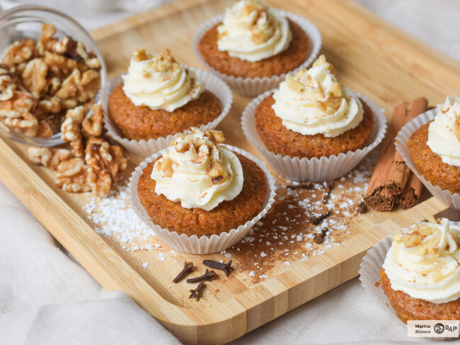 La zanahoria aporta jugosidad y un color que invita a morder; nuestra particular mezcla de especias, el toque aromático que las hace irresistibles. Nosotros las preparamos además con un poco de yogur griego, y utilizamos azúcar moreno como endulzante. Después las enriquecemos con un frosting de queso crema y nueces picadas.