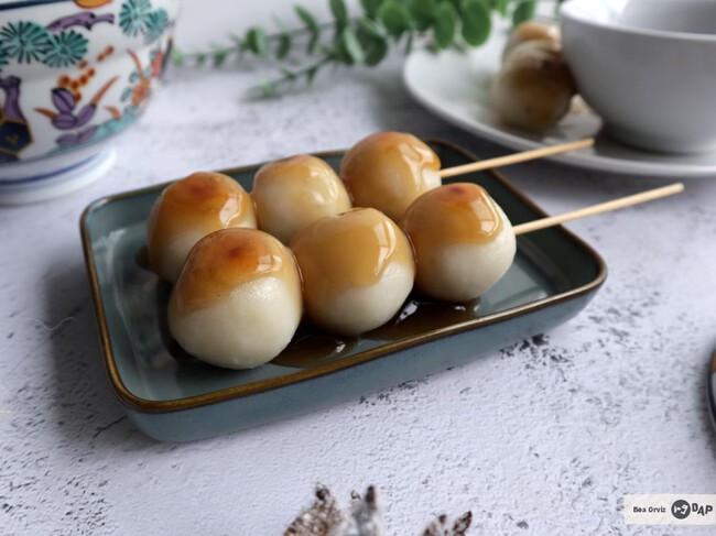 El Dango (団子) es un dulce japonés muy típico hecho con masa de arroz. Son bolitas pequeñas que se cuecen, se pinchan en brochetas y se sirven de distintas formas. En este caso, el mitarashi dango lleva un glaseado espeso y brillante hecho con salsa de soja, azúcar y mirin. El resultado es una combinación entre dulce y salado, con una textura suave y un sabor muy especial.