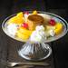 Para terminar el plato, alrededor del flan colocamos trozos de melocotón en almíbar, unas guindas confitadas, unas rosetas de nata montada y una bola de helado. Servimos rápidamente bien frío el conjunto.