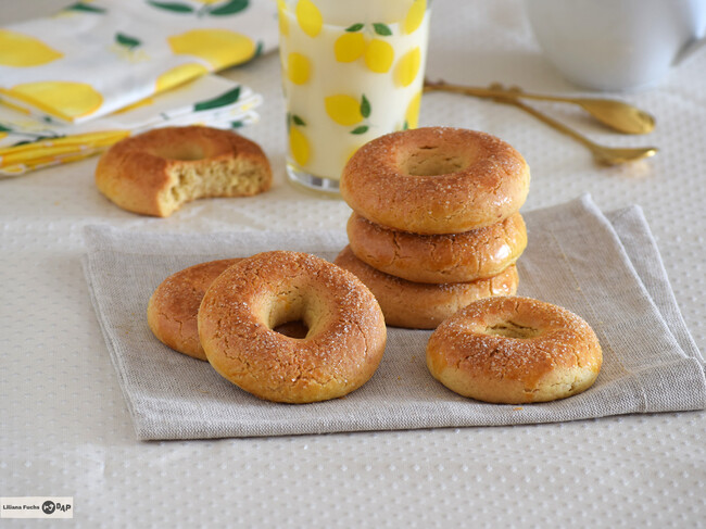 Se pueden hacer haciendo una bola y formando el agujero en el centro con el dedo, o estirando cilindros de masa para juntar las puntas. Colocarlos en las bandejas ligeramente separados, pintar con el huevo batido y espolvorear con azúcar. Si los hacemos más pequeños nos saldrán más y se hornearán antes.