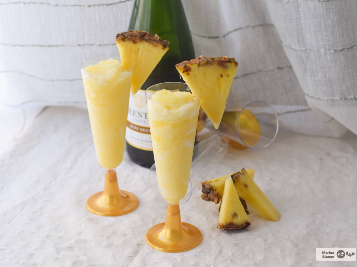 El sorbete de piña al cava es ideal para servir en una comida festiva, ya sea como prepostre, antes de un dulce más contundente, o entre los entrantes y el plato principal, pues sirve para refrescar y aligerar la comida.
