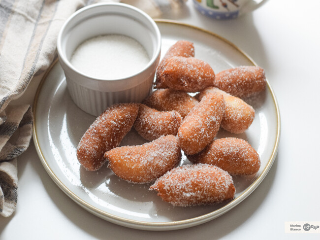 Los dejamos escurrir sobre papel de cocina absorbente, y los rebozamos en azúcar cuando aún están calientes.