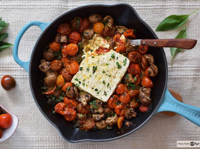 - Cena. Sartén de tomates cherry, champiñones y queso feta al horno con acompañamiento de pan de yogur para mojar.