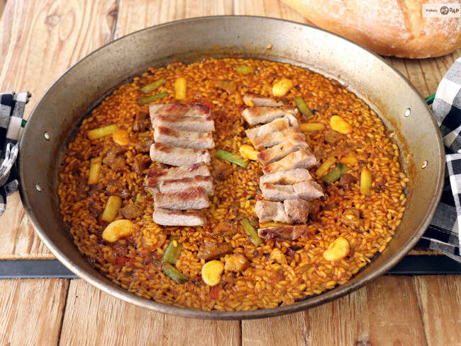 - Comida. Arroz con secreto cocinado en paella.