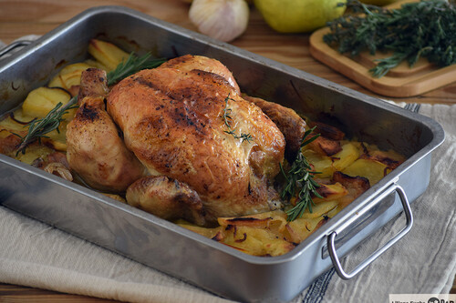 - Comida. Pollo al horno de Karlos Arguiñano con su guarnición de patatas asadas acompañado de puré de manzana.