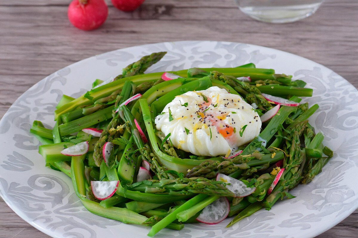 - Cena. Ensalada templada de espárragos verdes con huevo poché.