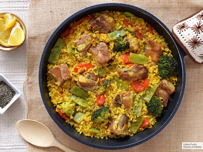 - Comida. Arroz con costillejas y verduras.