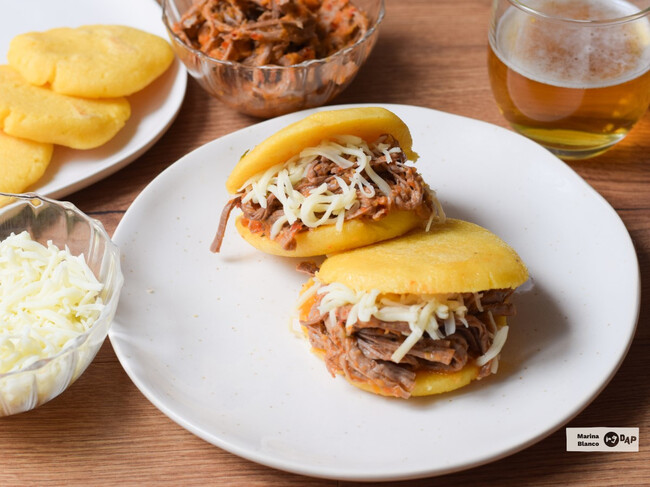 Estas arepas venezolanas combinan una carne deshilachada jugosa y sabrosa, que mezclada con el queso rallado y el sabor a maíz de la arepa, crean un contraste perfecto de sabores.