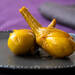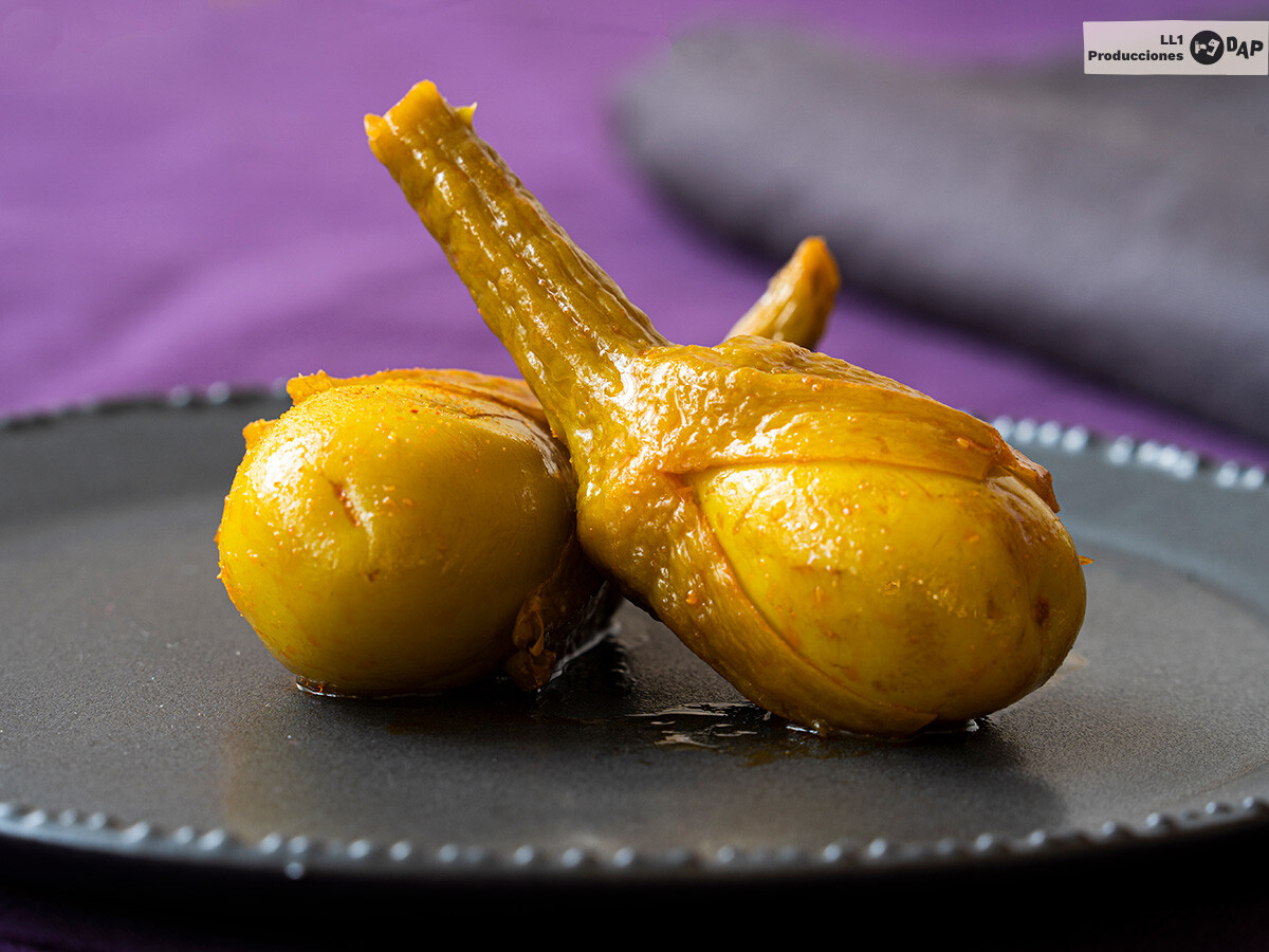 Distintas de las berenjenas que habitualmente utilizaríamos para otras recetas, este tipo de berenjenas se recolectan aún cuando tienen un tamaño medio y una estructura radicular que las hace especialmente tiernas y la razón por la que su 'rabito' es más grande, en proporción a una berenjena madura.