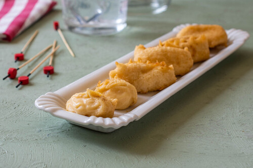 Primero se prepara una bechamel con queso, se deja enfriar y se refrigera hasta que la masa quede firme. Después, antes de cocinar, se saca unos minutos, se porciona, se le da forma y se reboza. Y ahí aparece la diferencia: en lugar de pan rallado, se recurre a una masa ligera tipo tempura.