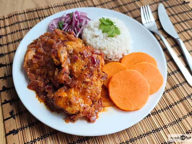 El adobo de pollo es un guiso típico de Perú. El término “adobo” viene de España, donde se usaba sobre todo como marinada para carnes y pescados. En Perú, sin embargo, la receta evolucionó hasta convertirse en un guiso en el que el pollo se cocina con una mezcla de ajíes, especias y un toque ácido que le da la chicha de jora.