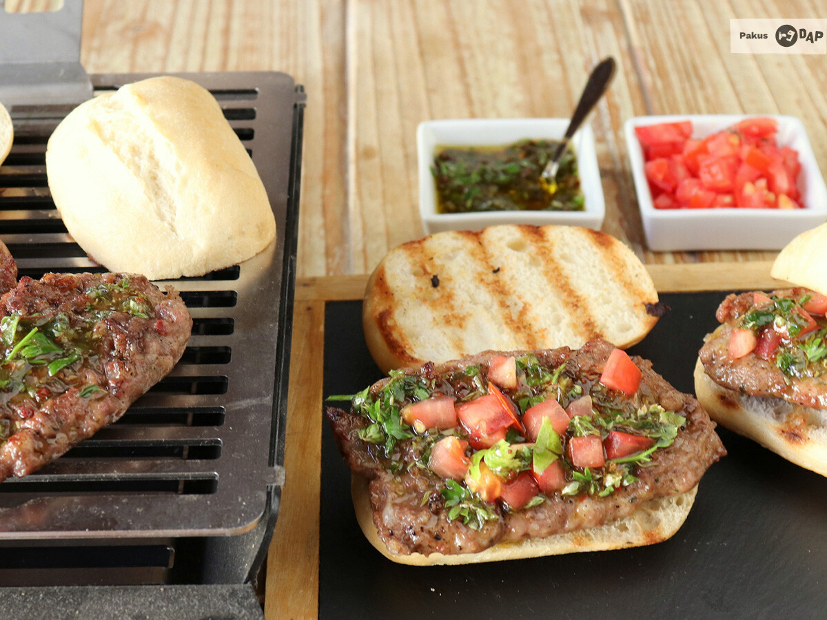 Abrimos y tostamos ligeramente los panecillos aprovechando el calor de la parte lateral de la barbacoa. Mientras tanto, habremos preparado un chimichurri casero tal como os enseñamos, y picaremos un tomate en pequeños dados. Montamos los bocadillos y llevamos a la mesa para que lleguen bien calientes.