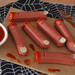Colocar una almendra a modo de uña en cada extremo. Llenar un cuenco con kétchup o con una salsa de tomate de color rojo brillante, y untar cada extremo cortado de las salchichas.
