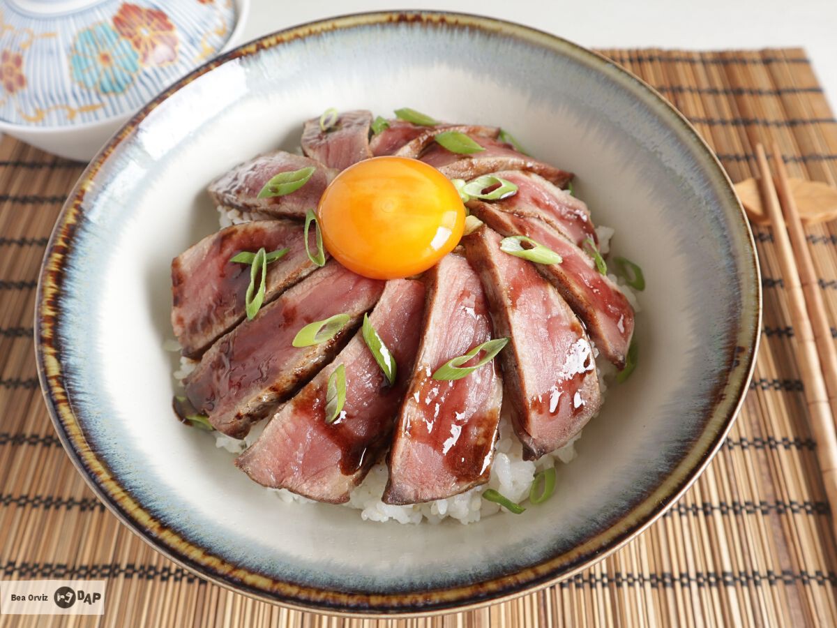 La versión que te traigo aquí es un donburi de ternera casero, algo más elaborado. En Japón lo habitual sería hacerlo con wagyu, una carne premium que hoy en día está muy de moda en versiones más modernas de este plato. Yo en cambio he utilizado un buen entrecot, que es más fácil de encontrar, bastante más asequible y queda igualmente jugoso y sabroso. Al final es un plato que puedes ver en restaurantes japoneses, pero también se disfruta muchísimo en casa si usas ingredientes de calidad y un poco de mimo.