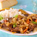 Cuando la cebolla empiece a tomar color, agregamos los jugos de la marinada que habíamos reservado y opcionalmente, podemos añadir también un tomate despepitado y cortado en gajos. Cuando el líquido vuelva a espesar, regresamos la carne a la sartén y añadimos un poco de caldo de carne o de pollo, dejando que se cocine todo junto.