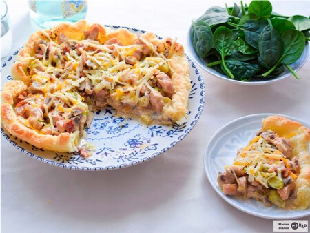 En nuestra fórmula, hemos añadido panceta antes del pollo, para que dé sabor y quede jugosa. Aparte de ella, cuando tengamos el pollo listo, lo reservamos y en esa cazuela salteamos unos puerros cortados en rodajas y unos champiñones picados. Una vez estén listos y bien secos, integramos el pollo, incorporamos nata y, apenas un minuto después, lo retiramos del fuego y llevamos la mezcla a la base del hojaldre, gratinando en el horno precalentado con un poco de queso mozzarella durante cinco minutos, hasta que esté doradito.